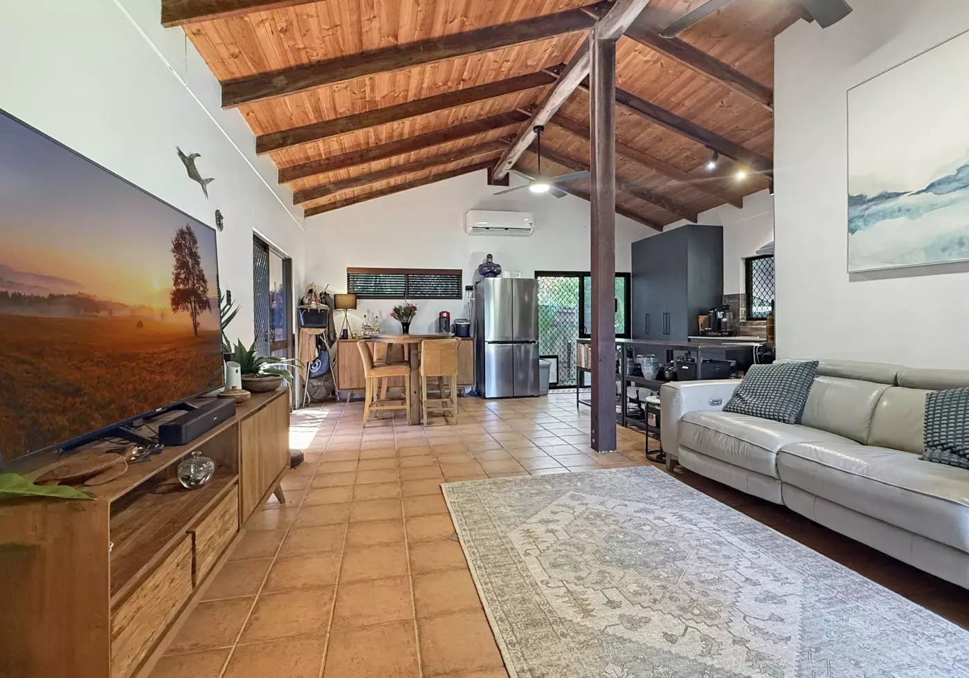 • Open-plan kitchen, dining, and living area with raked timber-lined ceilings