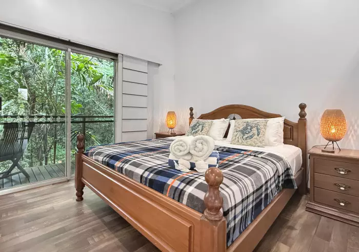 Just across from the beach, Lorikeet Cottage is a cosy rainforest retreat with a spa bath, open-plan living, kitchenette, and two private patios with BBQ. Fully fenced for pets and sharing a tropical resort-style pool, it’s the perfect spot to relax and unwind in paradise!