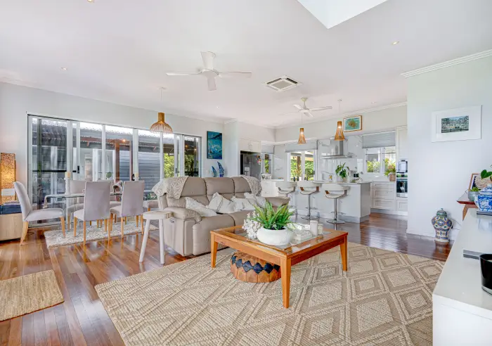 Polished spotted gum floors, soaring ceilings and beautifully resolved interiors bring warmth and sophistication throughout. At the heart of the home, the main living pavilion opens seamlessly to the outdoors, where the decks, pool, spa and established gardens create a resort-like setting designed for both quiet retreat and large-scale entertaining.