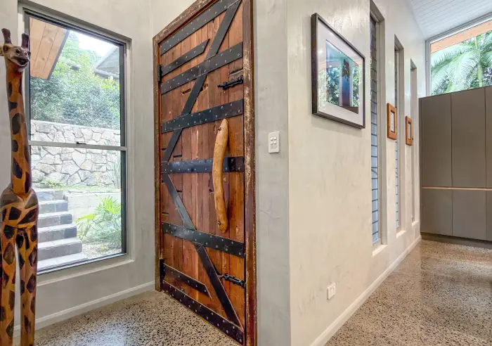 Completed in 2022, the main residence has been crafted with a clear commitment to quality, detail and timeless design. Polished concrete floors, striking stonework, reclaimed bridge timbers and a refined material palette bring warmth, texture and individuality to the home, while the open-plan living domain extends effortlessly to an exceptional outdoor entertaining space immersed in the rainforest backdrop.